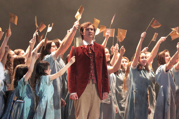 “Tenor Alexandros Tsilogiannis has no voice so only acts his part. His voice is lent to him from the orchestra pit by Caspar Singh from the opera studio of the Bayerische Staatsoper “next door”. It’s a pity for Tsilogiannis, but as a viewer and listener I personally think the two mastered the difficult situation perfectly”